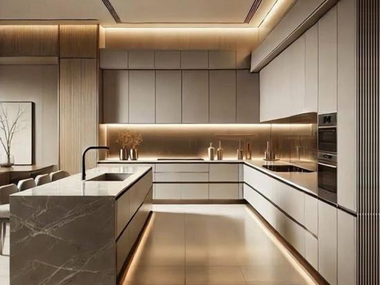 Este es un mueble de cocina italiano moderno y minimalista. La incorporación de tiras de luz LED le da a la cocina un toque de lujo y sofisticación.
