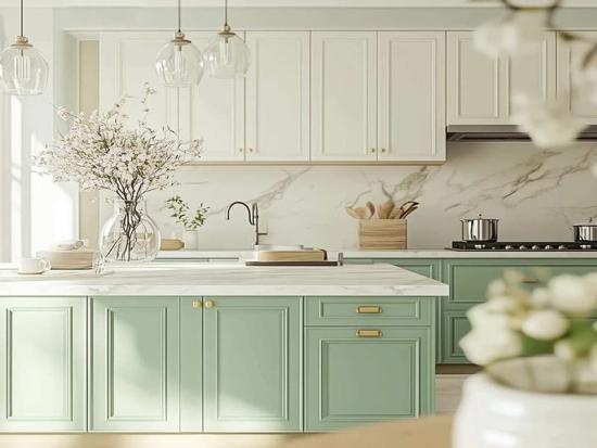 Este es un Gabinete de cocina de estilo europeo de color crema Con un armario de pared blanco y un armario de suelo verde claro con tiradores dorados, la cocina se llena de un ambiente refrescante y natural.