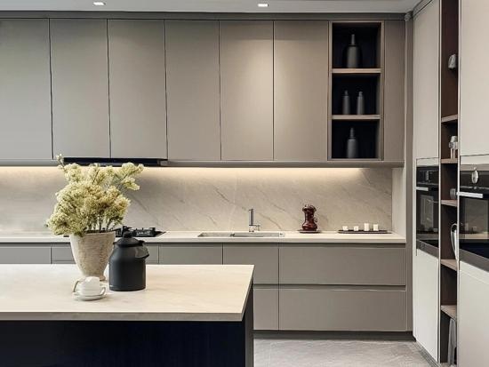 Este ahorra espacio gabinetes de cocina en forma de L Con un moderno acabado gris, está diseñado para ofrecer eficiencia y estilo. Proporciona amplio espacio de almacenamiento junto con prácticos estantes abiertos para un acceso rápido a los utensilios de cocina esenciales. La isla de cuarzo blanco incluida no solo añade una elegante encimera, sino que también sirve como un comedor práctico y rápido para la familia, convirtiéndose en el corazón perfecto de un hogar activo.