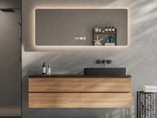 Este tocador de baño de madera combina magistralmente el encanto cálido y natural con la sofisticación moderna. Cuenta con cuatro cajones espaciosos para un amplio almacenamiento, un hermoso acabado de veta de madera y una audaz encimera negra con un lavabo a juego. El espejo inteligente integrado añade un toque final de tecnología premium, creando un espacio de baño que es altamente funcional y estéticamente elevado.